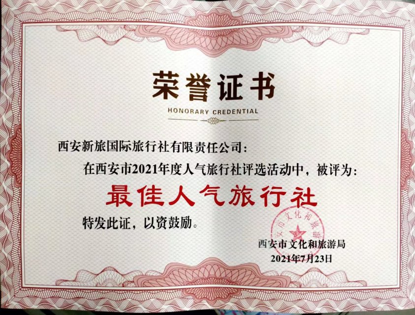 旅行社簡介: 西安新旅國際社地處西安鐘樓商圈,是一家綜合性旅游企業(yè)。先后組織接待了眾多大型旅游團(tuán)隊,得到國內(nèi)外游客和同行的好評!近年來企業(yè)規(guī)模不斷壯大,分公司遍布四川、甘肅、新疆、陜西、內(nèi)蒙、青海、貴州等省。主營濱海度假、草原休閑、山岳探險、鄉(xiāng)村民俗、紅色旅游線路等。其中紅色旅游線路涵蓋省內(nèi)所有紅色景點(diǎn)及省外主要紅色景區(qū),接待并服務(wù)過近百家企事業(yè)單位。我社將繼續(xù)開發(fā)設(shè)計高質(zhì)量旅游產(chǎn)品并提供全方位、多元化、高層次的服務(wù)。