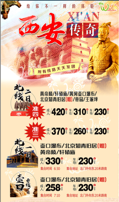 5、旅游產(chǎn)品豐富、種類齊全。竭誠為您提供以下服務(wù):提供陜西省內(nèi)旅游、國內(nèi)旅游以及國際接待旅游產(chǎn)品;為您提供自助旅游、團隊旅游線路策劃設(shè)定;為您提供酒店預(yù)訂、旅游包車、導(dǎo)游委派等;為您待定機票、火車票、大巴、輪船等各種交通票務(wù);承辦各種會議、展覽、專業(yè)團體考察、學(xué)術(shù)交流、商務(wù)活動等。